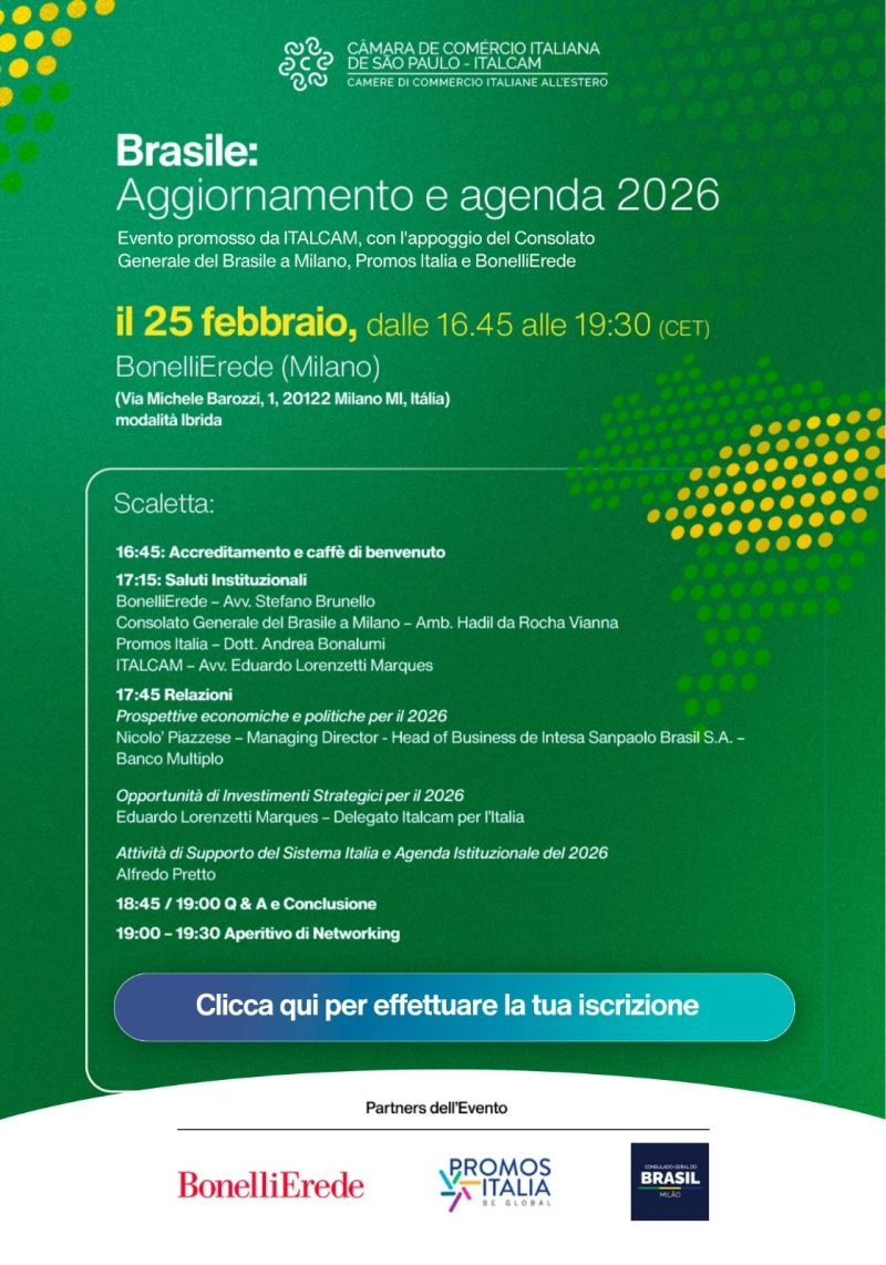 La Camera di Commercio Italiana di San Paolo organizza la seconda edizione di “Brasile Agenda 2026”, un momento di approfondimento dedicato alle prospettive economiche e politiche del Brasile e alle opportunità di investimento per il prossimo anno. L’incontro si svolgerà il 25 febbraio 2026 in modalità ibrida, con partecipazione in presenza presso l’auditorium di BonelliErede a Milano e collegamento digitale.