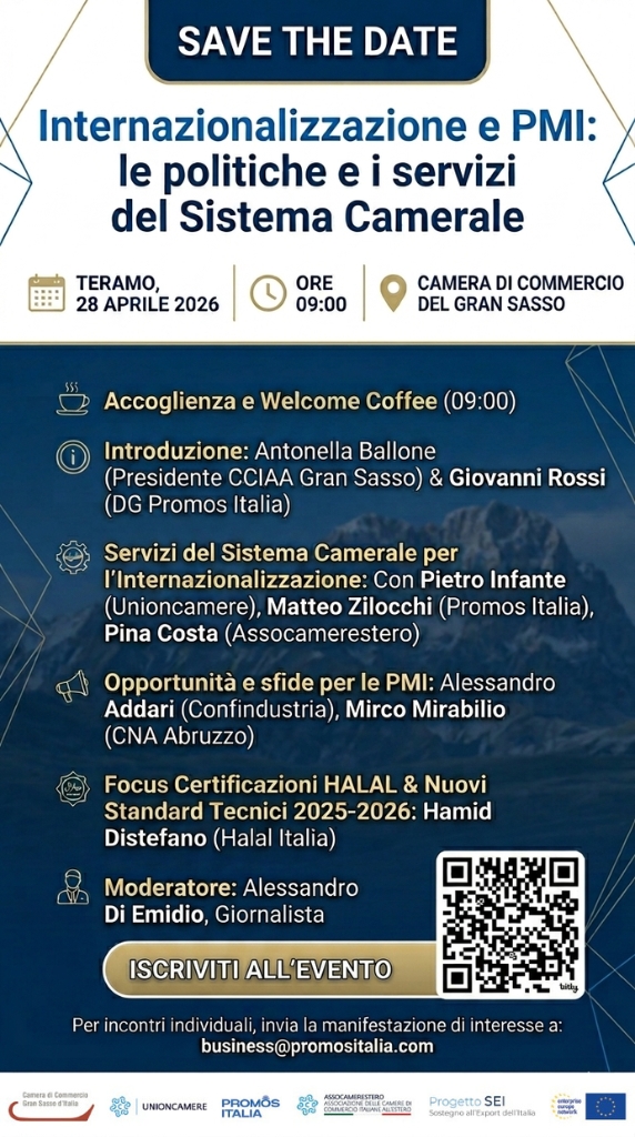 Il prossimo 28 aprile, a partire dalle ore 9:00, si terrà a Teramo, presso la sede della Camera di Commercio del Gran Sasso d’Italia, l’incontro “Internazionalizzazione e PMI: le politiche e i servizi del Sistema Camerale”, promosso nell’ambito del Progetto SEI – Sostegno all’Export dell’Italia.