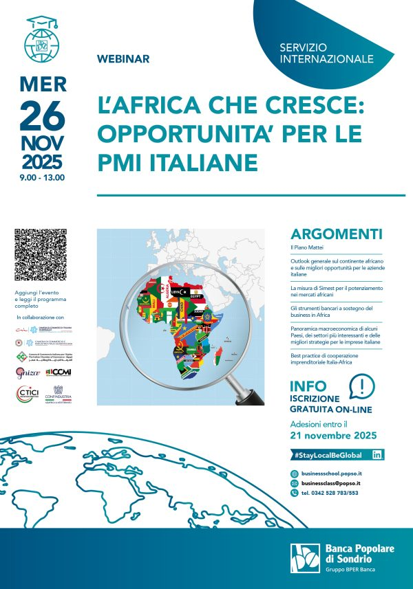 Prosegue il ciclo di incontri del Servizio Internazionale della Banca Popolare di Sondrio dedicato alle imprese interessate a sviluppare la propria presenza sui mercati esteri. Il prossimo appuntamento sarà interamente dedicato al continente africano, una delle aree più dinamiche e promettenti per la crescita dell’interscambio con l’Italia, con il webinar: L’Africa che cresce – Opportunità per le PMI italiane.