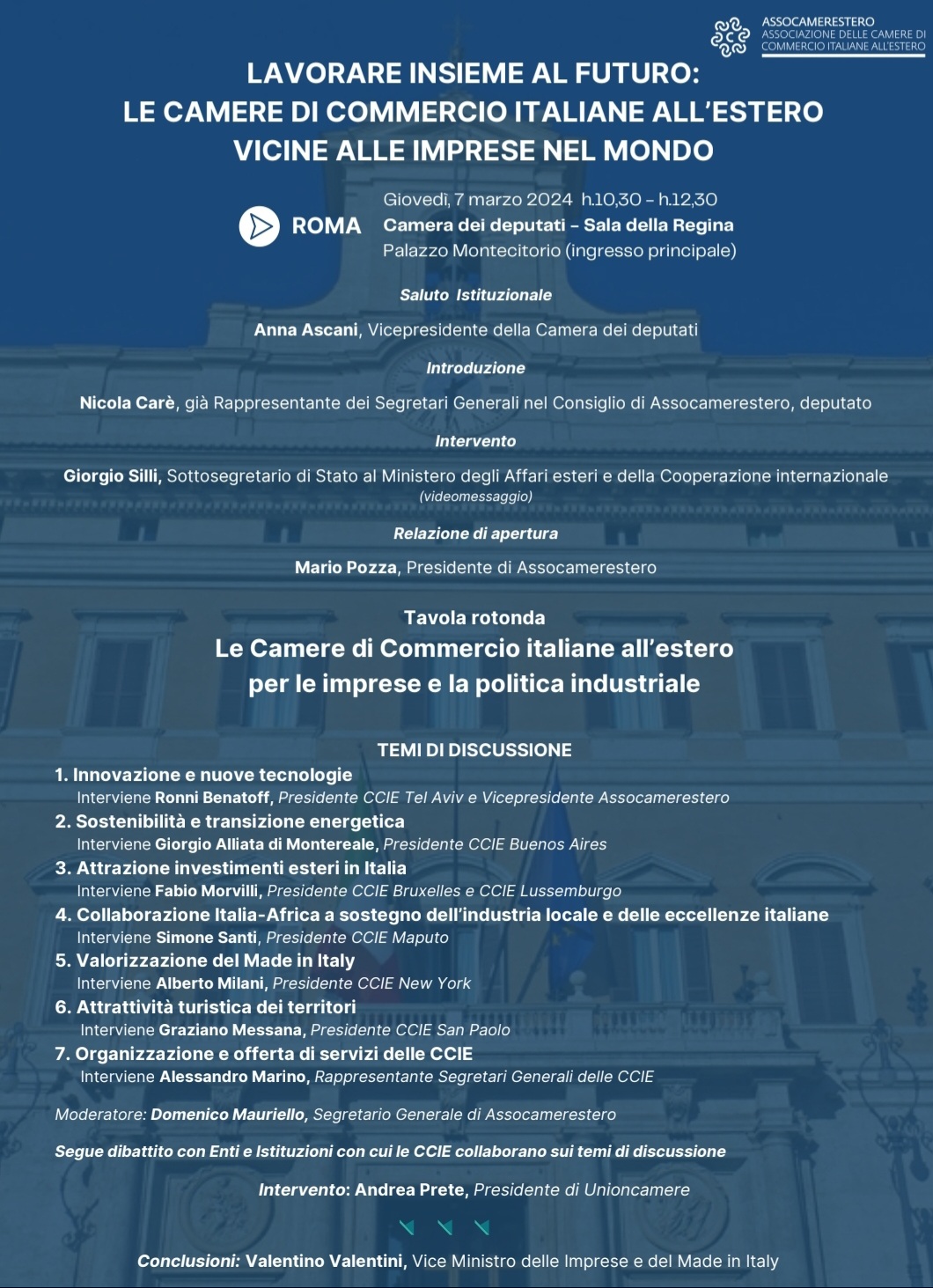 Si svolgerà il 7 marzo presso la Camera dei Deputati, davanti ad un pubblico di parlamentari, organismi della promotion pubblica e associazioni imprenditoriali, l’evento di presentazione del programma delle Camere di Commercio italiane all’estero per il prossimo anno e la presentazione dei dati preliminari sulle attività svolte nel 2023.
