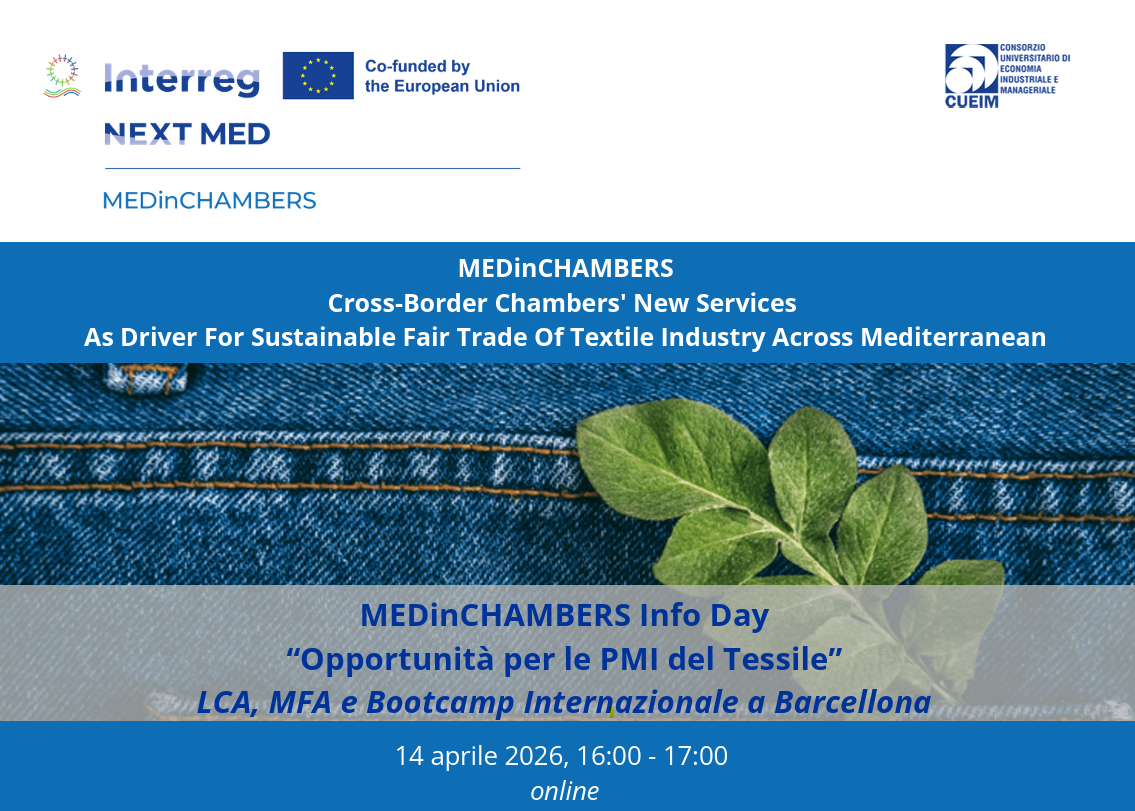 In questo scenario si inserisce il progetto MEDinCHAMBERS, co-finanziato dal Programma Interreg NEXT MED, che punta a sostenere le PMI delle filiere TCLF (Tessile, Abbigliamento, Pelle e Calzature) attraverso servizi condivisi, strumenti digitali e hub di conoscenza, favorendo modelli di business più sostenibili e competitivi. Il progetto vede la partecipazione attiva della Camera di Commercio Italiana – Barcellona (Spagna), della Camera Tuniso-Italiana di Commercio e Industria (Tunisia) e della Camera di Commercio e Industria Italiana in Turchia – Izmir (Turchia), nonchè il coinvolgimento di Assocamerestero in qualità di partner.