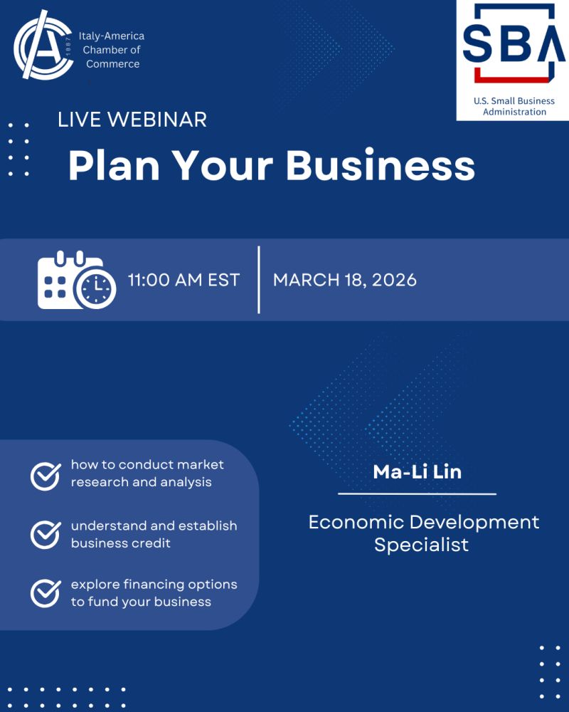 Pianificare l'ingresso o l'espansione nel mercato statunitense richiede non solo visione, ma anche una profonda conoscenza degli strumenti finanziari e operativi locali. Per questo motivo, la Italy-America Chamber of Commerce, in collaborazione con la Small Business Administration (SBA), l'agenzia governativa USA a sostegno delle imprese, lancia il webinar: "Plan Your Business".