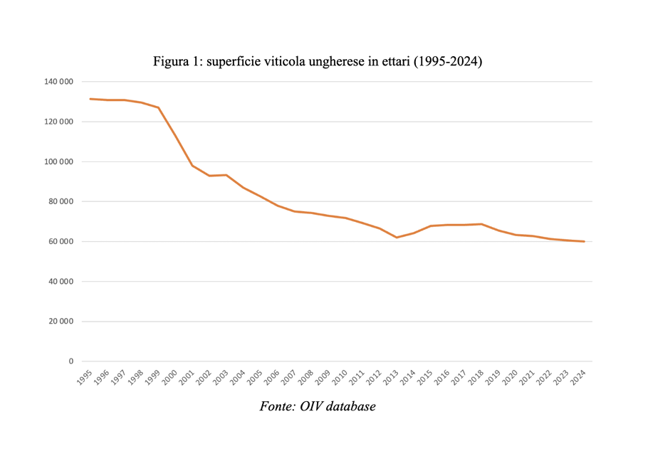 Negli ultimi decenni, tuttavia, il settore ha attraversato una fase di ridimensionamento strutturale. Le superfici vitate sono diminuite sensibilmente, passando dai 135 mila ettari del 1995 ai 60 mila ettari del 2024 (Figura 1).