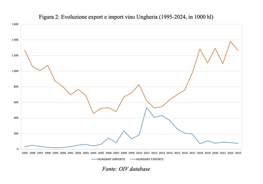 Parallelamente, anche le esportazioni hanno registrato una flessione: dai 803 mila ettolitri dei primi anni duemila si è scesi a circa 544 mila ettolitri nel 2013. Tuttavia, negli ultimi anni, il settore vinicolo ungherese ha nuovamente registrato una nuova fase di crescita, arrivando, nel 2023, a raggiungere 1.266 mila ettolitri esportati (Figura 2).