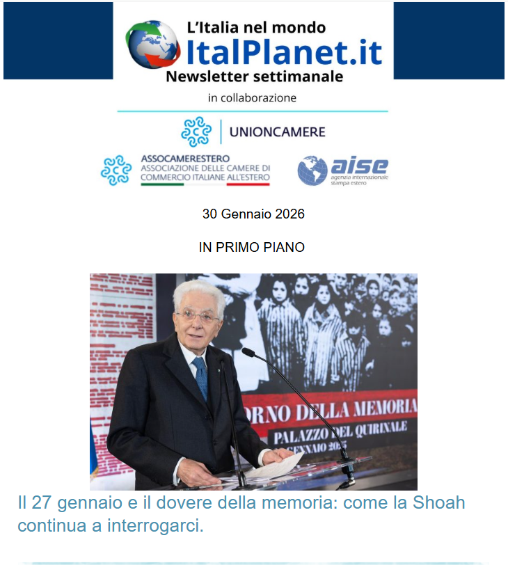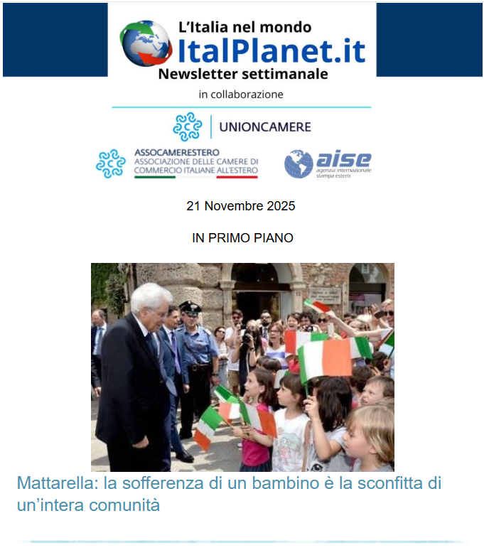 La newsletter di ItalPlanet, pubblicata in collaborazione con Assocamerestero e Aise.it – inviata in Italia e all’estero – è un servizio settimanale che consente di ricevere news e approfondimenti sul Sistema Italia e sulle attività svolte dalle Camere Italiane nel mondo.