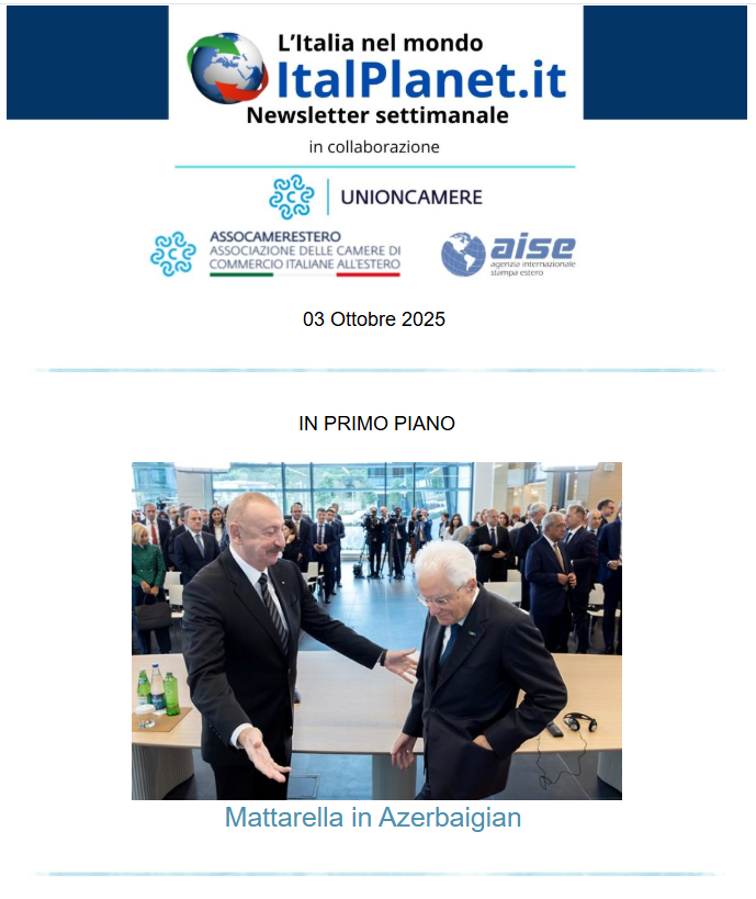 ​La newsletter di ItalPlanet, pubblicata in collaborazione con Assocamerestero e Aise.it – inviata in Italia e all’estero – è un servizio settimanale che consente di ricevere news e approfondimenti sul Sistema Italia e sulle attività svolte dalle Camere Italiane nel mondo.