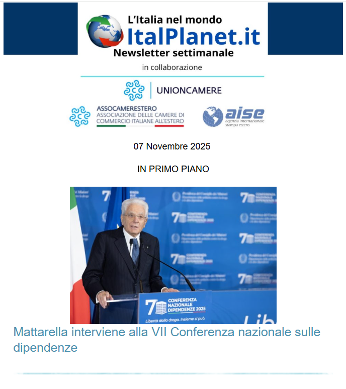 La newsletter di ItalPlanet, pubblicata in collaborazione con Assocamerestero e Aise.it – inviata in Italia e all’estero – è un servizio settimanale che consente di ricevere news e approfondimenti sul Sistema Italia e sulle attività svolte dalle Camere Italiane nel mondo.