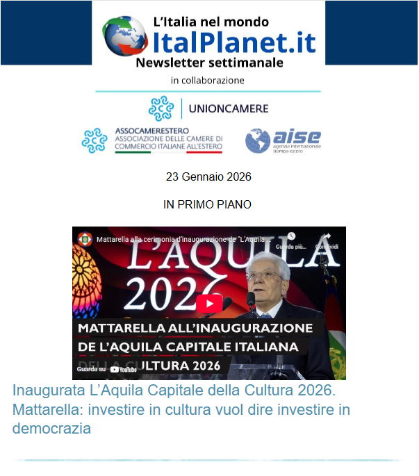 La newsletter di ItalPlanet, pubblicata in collaborazione con Assocamerestero e Aise.it – inviata in Italia e all’estero – è un servizio settimanale che consente di ricevere news e approfondimenti sul Sistema Italia e sulle attività svolte dalle Camere Italiane nel mondo.